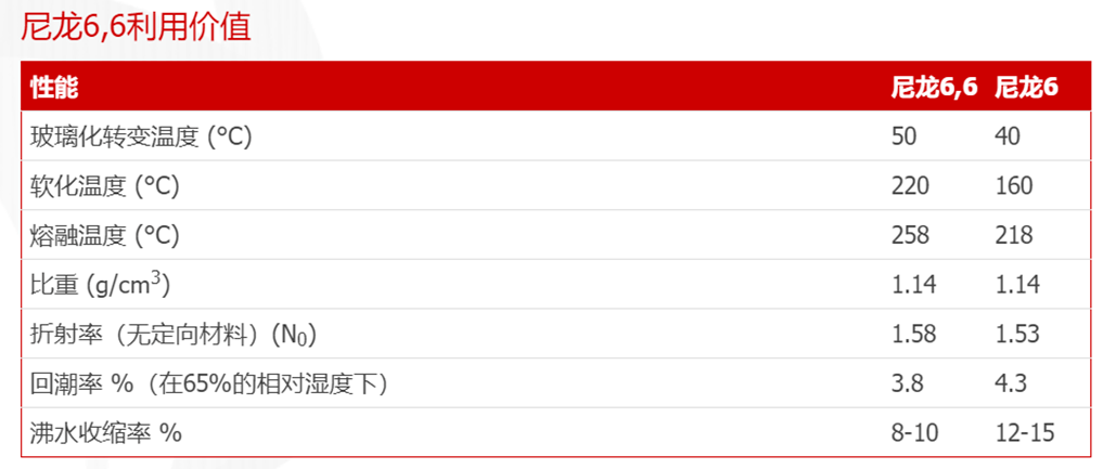 不同于PA6約有70%-80%用于紡絲,只有10-20%左右用于工程塑料。PA66目前有60%左右用于工程塑料,而PA66相對于PA6在性能上面也有明顯優(yōu)勢: