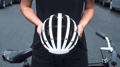 這款頭盔采用了可活動(dòng)的骨架組成主體,骨架之間使用尼龍繩連接,騎行的時(shí)候戴在頭上。下了車,可以輕松的把它折疊起來。折疊后只有 9.2 厘米厚,放進(jìn)包里很輕松。