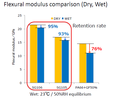 在下圖中,可以看到最新的SG106和SG105,分別是 60%和 50%玻璃纖維增強(qiáng)PA66復(fù)合材料,其彎曲模量在干態(tài)和濕態(tài)的變化中,保持率在 90%以上,而我們標(biāo)準(zhǔn)的PA66+50%玻璃纖維,剛性保持率卻只有 76%,除了性能區(qū)別之外,在VOC和磨耗性能方面,新牌號(hào)都帶來了新的變化,該產(chǎn)品也被定義為汽車內(nèi)飾以塑代鋼專用材料。